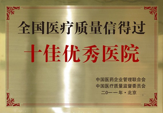 2011年12月,中国医疗质量监督委员会、中国医院企业管理联合会共同授予我院“全国医疗质量信得过十佳优秀医院”称号,以表彰我院在狠抓医疗质量管理工作中取得的突出成绩。本次评审十分严格,我院是在参审的全国数千家医疗机构中脱颖而出,得到评审单位的高度评价!